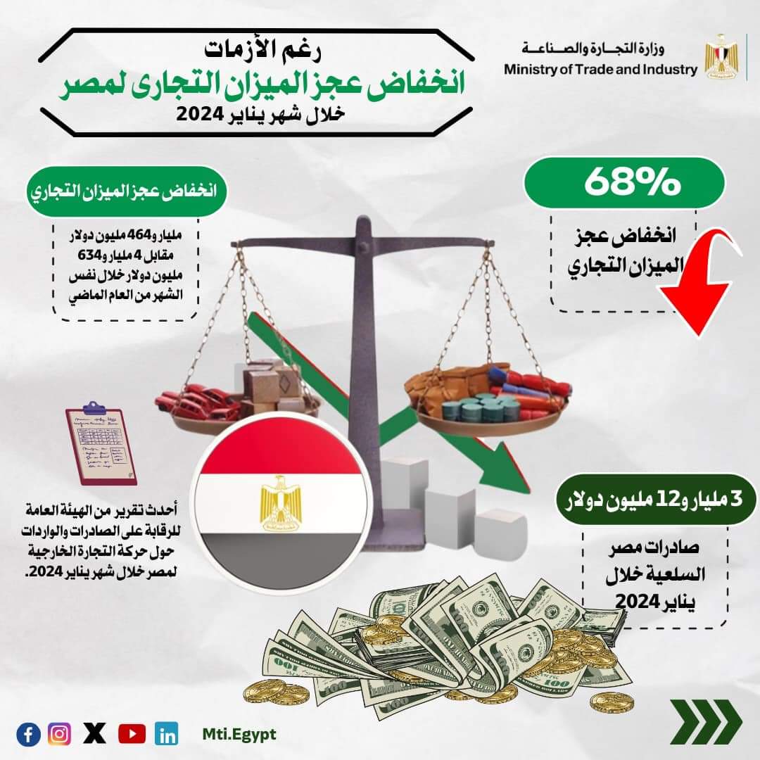 The minister said that these positive indicators contributed to the decrease in the trade deficit by 68% during the month of January, as it reached one billion and 464 million dollars, compared to 4 billion and 634 million dollars during the same month last year.