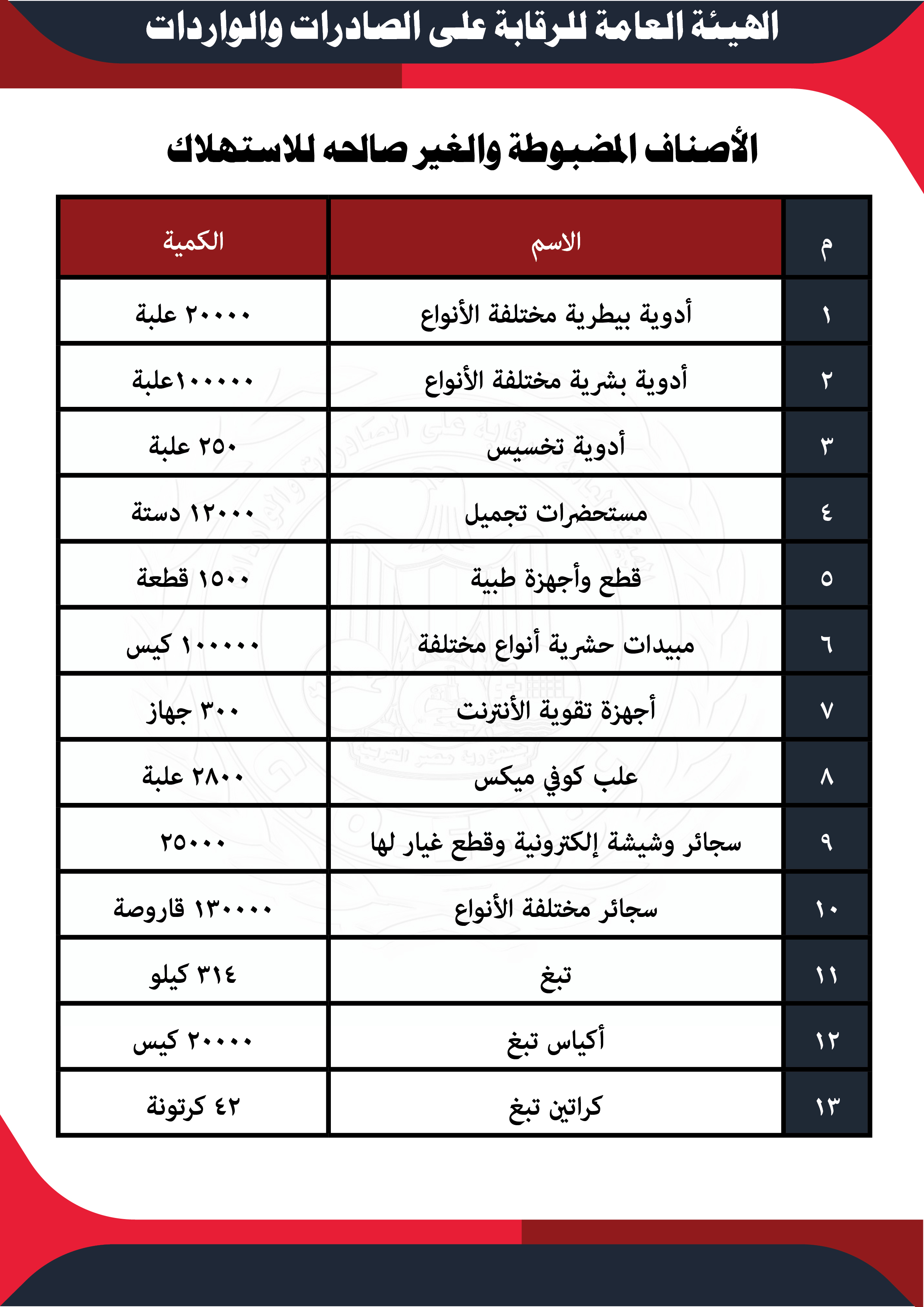 وتم إعداد محاضر لإعدام كافة الأصناف الغير صالحه للاستهلاك وصدر قرار من النيابة العسكرية بتسليمها لمخازن مصلحة الجمارك.